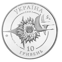 | На аверсі монети в центрі в намистовому колі зображено малий Державний Герб України в оточенні алегоричної композиції із сонця, стилізованого крила, птахів (праворуч) та зірок, що втілює мрію людства досягти космічних висот, та кругові написи: УКРАЇНА, 2003, 5, ГРИВЕНЬ. та логотип Монетного двору Національного банку України |