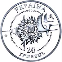 | На аверс_ монети в центр_ в намистовому кол_ зображено малий Державний Герб України в оточенн_ алегоричної композиц_ї _з сонця, стил_зованого крила, птах_в (праворуч) та з_рок, що вт_лює мр_ю людства досягти косм_чних висот, та кругов_ написи: на монет_ _з ср_бла - УКРАЇНА, 2002, 20, ГРИВЕНЬ, а також позначення металу та його проби - Ag 925, вага в чистот_ - 62,2 та логотип Монетного двору Нац_онального банку України. |