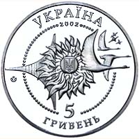 | На аверсі монети в центрі в намистовому колі зображено малий Державний Герб України в оточенні алегоричної композиції із сонця, стилізованого крила, птахів (праворуч) та зірок, що втілює мрію людства досягти космічних висот, та кругові написи: УКРАЇНА, 2002, 5, ГРИВЕНЬ. та логотип Монетного двору Національного банку України. |