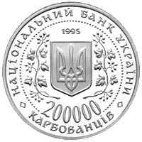 | На аверсі монети в центрі кола, утвореного намистовим узором, знаходиться зображення малого Державного герба України в обрамленні з двох боків гілками калини. Кожна гілка має п`ять листків і три грона ягід. Верхнє гроно складається з семи ягід, середнє - з п`яти, нижнє - з шести. Над гербом розміщена дата 1995 - рік карбування монети, під гербом - у два рядки по колу напис 200000 КАРБОВАНЦІВ, який позначає номінальну вартість монети (число 200000 розміщено в розриві намистового узору). Між зовнішнім кантом і намистовим узором вгорі по колу напис НАЦІОНАЛЬНИЙ БАНК УКРАЇНИ, відокремлений з двох боків від слова КАРБОВАНЦІВ розділовими позначками у вигляді ромбів. |