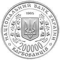 | На аверсі монети в центрі кола, утвореного намистовим узором, знаходиться зображення малого Державного герба України в обрамленні з двох боків гілками калини. Кожна гілка має п`ять листків і три грона ягід. Верхнє гроно складається з семи ягід, середнє - з п`яти, нижнє - з шести. Над гербом розміщена дата 1995 - рік карбування монети, під гербом - у два рядки по колу напис 200000 КАРБОВАНЦІВ, який позначає номінальну вартість монети (число 200000 розміщено в розриві намистового узору). Між зовнішнім кантом і намистовим узором вгорі по колу напис НАЦІОНАЛЬНИЙ БАНК УКРАЇНИ, відокремлений з двох боків від слова КАРБОВАНЦІВ розділовими позначками у вигляді ромбів |