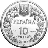 | На аверсі монети в обрамленні вінка, утвореного із зображень окремих видів флори і фауни, розміщено малий Державний Герб України та написи в чотири рядки: на монеті із срібла - УКРАЇНА, 10 ГРИВЕНЬ, 2003, а також позначення металу та його проби - Ag 925, вага в чистоті - 31,1; та логотип Монетного двору Національного банку України. |