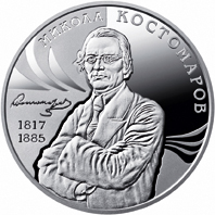 На реверсі монети зображено портрет Миколи Костомарова; ліворуч від нього його факсиміле та роки життя: 1817/1885; угорі півколом напис - МИКОЛА КОСТОМАРОВ. |
