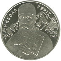На реверсі монети на стилізованому тлі гір зображено Миколу Реріха, який тримає в руці `Кобзар` - одну з найулюбленіших книг, угорі півколом розміщено напис МИКОЛА РЕРІХ, праворуч - роки його життя 1874/1947. |