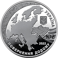 | На аверсі монети на дзеркальному тлі розміщено: стилізоване зображення європейського континенту, ліворуч від якого декоративний елемент у вигляді мозаїчного декору, що символізує різноманіття народів, культур, свободу вибору власної долі, відсутність формальних кордонів; на європейському континенті виділено контури України, яка, ніби пазл, доповнює цілісність Європи та “повертається” додому, де завжди опосередковано була присутня, починаючи з династичних зв’язків Київської держави; праворуч: малий Державний Герб України та напис УКРАЇНА (півколом); номінал– 10 та графічний символ гривні; рік карбування монет – 2022 та напис – ПОВЕРНЕННЯ ДОДОМУ (унизу). |