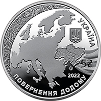 | На аверсі монети на дзеркальному тлі розміщено: стилізоване зображення європейського континенту, ліворуч від якого декоративний елемент у вигляді мозаїчного декору, що символізує різноманіття народів, культур, свободу вибору власної долі, відсутність формальних кордонів; на європейському континенті виділено контури України, яка, ніби пазл, доповнює цілісність Європи та “повертається” додому, де завжди опосередковано була присутня, починаючи з династичних зв’язків Київської держави; праворуч: малий Державний Герб України та напис УКРАЇНА (півколом); номінал – 5 та графічний символ гривні; рік карбування монет – 2022 та напис – ПОВЕРНЕННЯ ДОДОМУ (унизу); логотип Банкнотно-монетного двору Національного банку України (під картою України). |