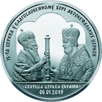 На реверсі монети на дзеркальному тлі зображено Вселенського Патріарха Варфоломія (ліворуч), який передає сувій (Томос) Митрополиту Київському і всієї України Епіфанію (праворуч) та написи: 15-ТА ЦЕРКВА У БЛАГОСЛОВЕННОМУ ХОРІ АВТОКЕФАЛЬНИХ ЦЕРКОВ (півколом угорі) та «СВЯТІША ЦЕРКВА УКРАЇНИ»/06.01.2019 (унизу). |