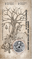 На реверсі монети на дзеркальному тлі зображено стилізований образ козака-характерника, який оберігає птаха – символ волі, що візуально нагадує тризуб. Композиція відображає зв’язок між сучасною війною та українським духом часів козаччини. На матовому тлі – зламані ворожі шаблі, що безсилі перед незламною любов’ю до рідної землі та прагненням до волі. |
