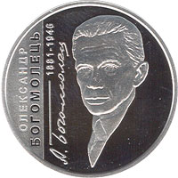 На реверсі монети зображено портрет Олександра Богомольця, ліворуч від якого вертикально розміщено написи: ОЛЕКСАНДР/ БОГОМОЛЕЦЬ/ 1881 - 1946, факсиміле. |