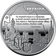 На аверсі медалі розміщено: угорі написи – 2022/УКРАЇНА, унизу – малий Державний Герб України, у центрі композицію: та тлі стилізованої карти міста рядки з історичного роману Ліни Костенко “Берестечко”: ЧИ СПРАВДІ ВІРИВ Я У ПЕРЕМОГУ/В ТАКІЙ ТЯЖКІЙ НЕРІВНІЙ БОРОТЬБІ?/ТАК, ВІРИВ Я. НАЙПЕРШЕ ВІРИВ – БОГУ./І ВІРИВ ЛЮДЯМ. ЛЮДЯМ І СОБІ./ЛІНА КОСТЕНКО; колаж з визначних пам’яток міста: харківський Кобзар – пам’ятник Тарасові Шевченку, один з найкращих зразків монументального мистецтва (ліворуч), пам’ятка, що входить до світової спадщини ЮНЕСКО, – будівля Держпрому, зведена в 1920-х роках у стилі конструктивізму, альтанка-фонтан “Дзеркальний струмінь” – один із сучасних символів міста; логотип Банкнотно-монетного двору Національного банку України (ліворуч над пам’ятником).