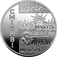 На реверсі медалі на дзеркальному тлі зображено стилізовану композицію, що символічно представляє сьогодення крізь призму твору уродженця Охтирки Івана Багряного “Тигролови”, у якому утверджується мужність, здатність перемагати: український захисник – новітній мисливець за “хижаками”, над яким сяє сонце, та написи: СМІЛИВІ (ліворуч вертикальний) ЗАВЖДИ (угорі) МАЮТЬ (праворуч) ЩАСТЯ (унизу). |