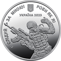 | На аверсі медалі: на дзеркальному тлі розміщено гасло сержантів і старшин Збройних Сил України СЛІДУЙ ЗА МНОЮ! РОБИ ЯК Я!, в центрі зображено українського сержанта-лідера, який веде за собою солдатів у бій, угорі – малий Державний Герб України та напис УКРАЇНА, рік карбування 2023, логотип Банкнотно-монетного двору Національного банку України (ліворуч від зображення сержанта). |