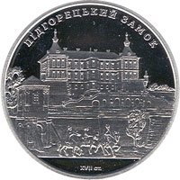 На реверсі монети зображено Підгорецький замок, на передньому плані вершників, на дзеркальному тлі розміщено написи - ПІДГОРЕЦЬКИЙ ЗАМОК (угорі півколом), XVII cт. (унизу). |