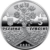 | На аверсі монети розміщено: у центрі на дзеркальному тлі абрису пейзажу – малий Державний Герб України (ліворуч), дерево життя – традиційний символ в орнаментиці українських тканих килимів, рушників, писанок тощо; праворуч зазначено номінал – 5, на тлі стилізованих килимів написи: УКРАЇНА (ліворуч), ГРИВЕНЬ (праворуч); унизу – рік карбування монет – 2021; у центрі, праворуч від дерева життя - логотип Банкнотно-монетного двору Національного банку України. |