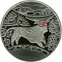 На реверсі монети в оточенні стилізованого рослинного орнаменту зображено в лубочному стилі бика (очі його оздоблені 2 рубінами масою по 0,01 карата). Над цією композицією і під нею розміщено абрисні фігурки всіх 12 символів східного календаря. |