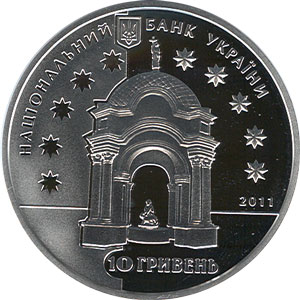 | На аверсі монети вгорі розміщено: малий Державний Герб України, напис півколом НАЦІОНАЛЬНИЙ БАНК УКРАЇНИ, унизу номінал - 10 ГРИВЕНЬ, фонтан `Самсон`, що на Подолі в місті Києві, в обрамленні восьмикутних зірок, які часто використовував Іван Григорович-Барський в архітектурному оздобленні (стиль бароко); праворуч - рік карбування монети 2011. |