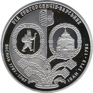 На реверсі монети зображено герб роду Григоровичів-Барських, стилізоване генеалогічне дерево, у картушах якого представлено малюнок мандрівника Василя Григоровича-Барського (ліворуч), на якому він зобразив себе, та церкву Миколи Набережного в Києві (праворуч), збудовану за проектом архітектора Івана Григоровича-Барського; по колу розміщено написи: РІД ГРИГОРОВИЧІВ-БАРСЬКИХ (угорі), ВАСИЛЬ 1701 - 1747 (ліворуч), ІВАН 1713 - 1785 (праворуч), девіз роду ТРУД МОЯ СИЛА (унизу). |