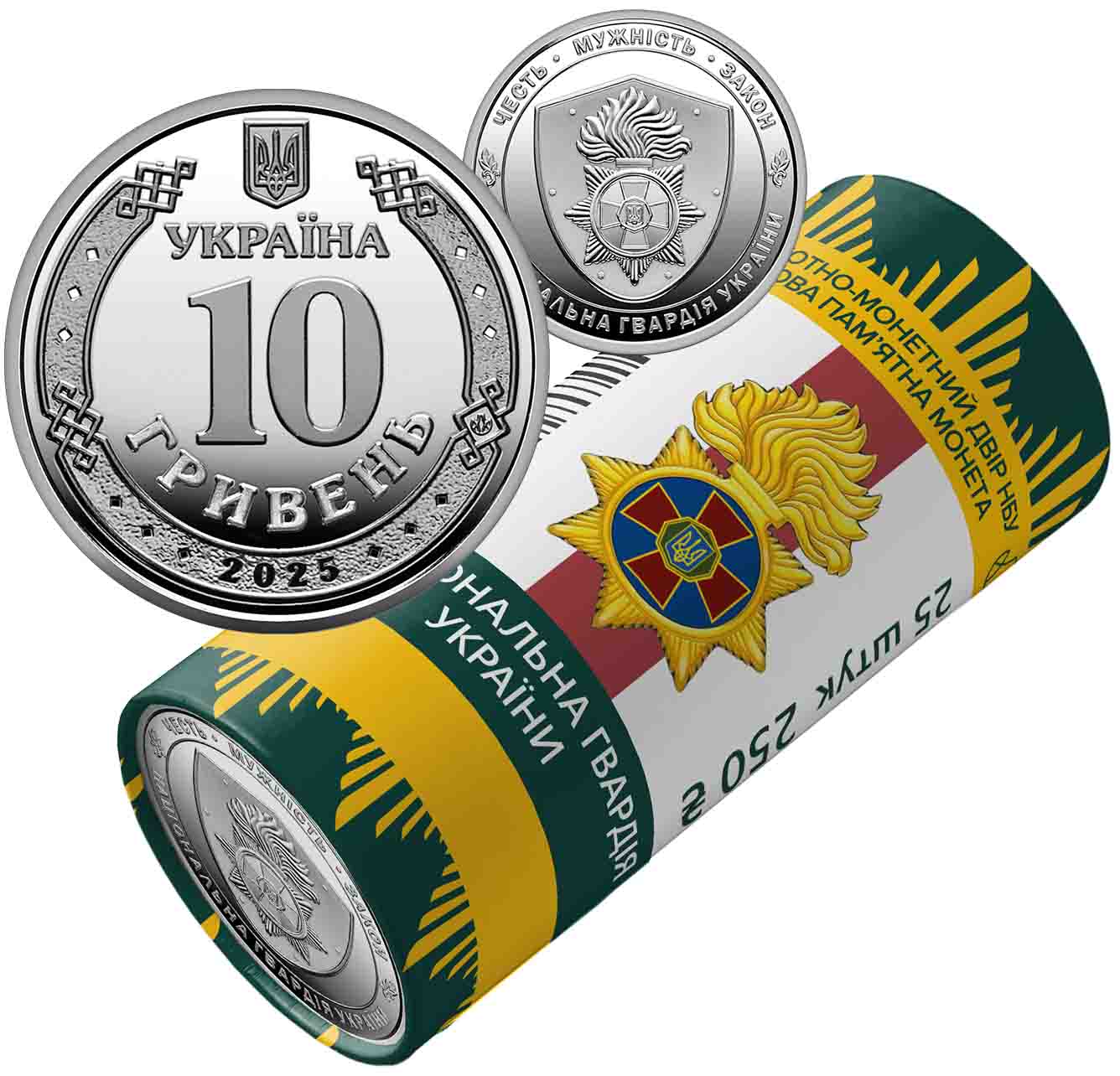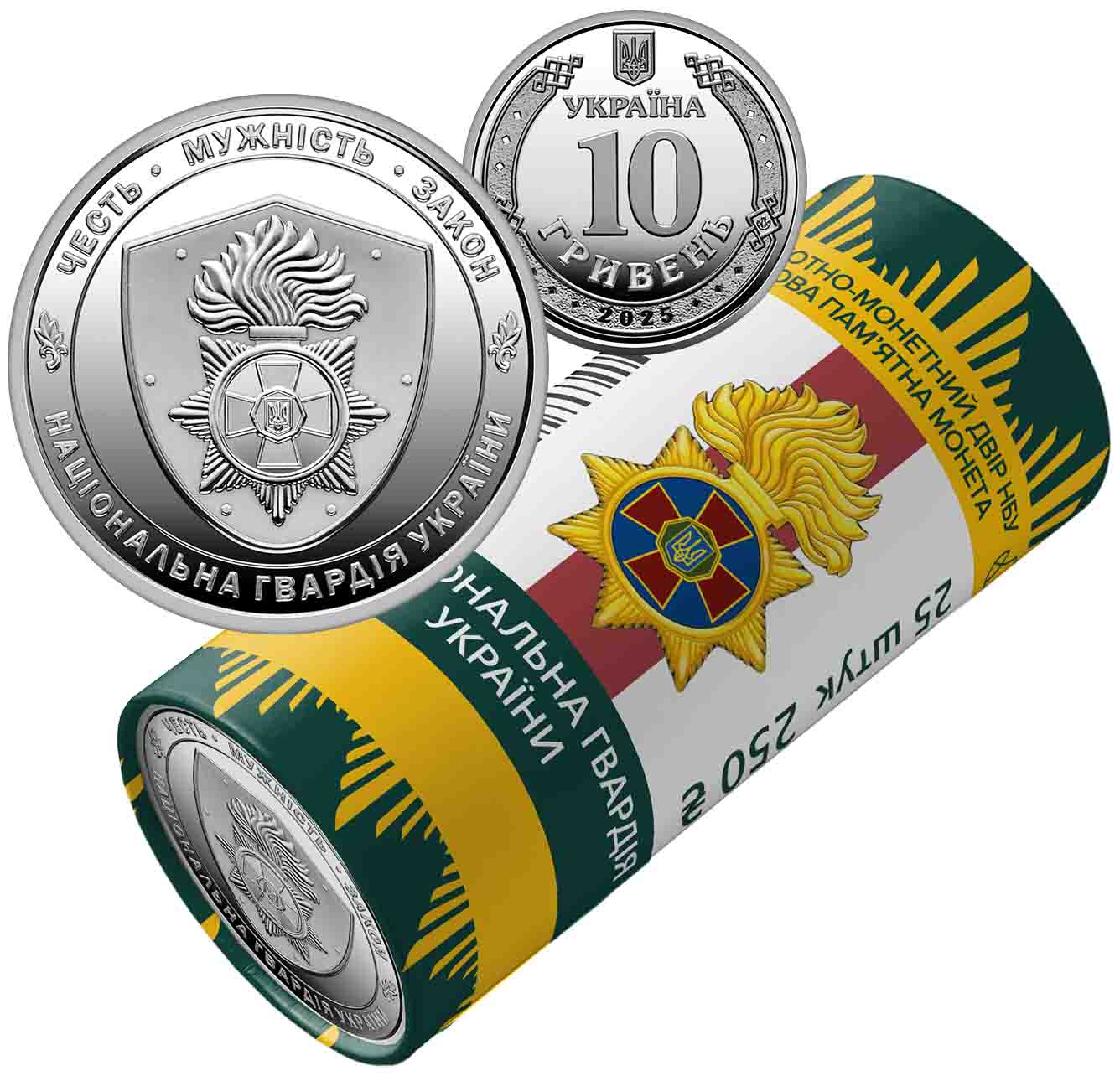 Ролик обігових пам’ятних монет “Національна гвардія України” присвячено військовому формуванню, що поєднує бойові та правоохоронні функції і входить до системи Міністерства внутрішніх справ України. Ця монета вшановує внесок нацгвардійців у захист суверенітету, територіальної цілісності, громадського порядку та безпеки України, символізуючи честь, мужність і непохитну вірність закону. На сувенірному папері, у який запаковано кожний ролик, розміщено написи: БАНКНОТНО-МОНЕТНИЙ ДВІР НБУ, ОБІГОВА ПАМ’ЯТНА МОНЕТА, НАЦІОНАЛЬНА ГВАРДІЯ УКРАЇНИ, 25 ШТУК, номінал 250 та графічний символ гривні; логотип Банкнотно-монетного двору Національного банку України, зображення беретного знака Національної гвардії України на тлі символічного щита.