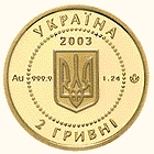 | На аверсі монети в бусинковому колі розміщено малий Державний Герб України, над яким - рік карбування монети 2003; кругові написи: УКРАЇНА (угорі), 2 ГРИВНІ (унизу), а також позначення металу, його проби - Au 999,9 (ліворуч), маса - 1,24 та логотип Монетного двору Національного банку України (праворуч). |
