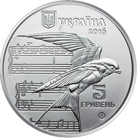| На аверсі монети на матовому тлі розміщено: угорі малий Державний Герб України, праворуч від якого напис УКРАЇНА, під яким рік карбування монети 2016, на тлі нотних рядків рельєфне зображення ластівки, під якою праворуч номінал - 5/ГРИВЕНЬ та логотип Бакнотно-монетного двору Національного банку України. |