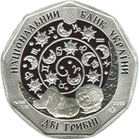 | На аверсі монети розміщено: угорі малий Державний Герб України, написи: угорі півколом - НАЦІОНАЛЬНИЙ БАНК УКРАЇНИ, унизу - номінал ДВІ ГРИВНІ та стилізовану композицію - на тлі зіркового неба зображення знаків зодіаку, під якими на місяці солодко спить дитина; рік карбування монети 2015 та логотип Монетного двору Національного банку України (праворуч), позначення металу, проби та маси Ag 925/7,78 (ліворуч). |