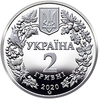 | На аверсі монети в обрамленні вінка, утвореного із зображень окремих видів флори і фауни, розміщено малий Державний Герб України та написи: УКРАЇНА/2/ГРИВНІ/2020 та логотип Банкнотно-монетного двору Національного банку України. |