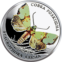 На реверсі монети на дзеркальному тлі зображено кольорову совку розкішну (використано тамподрук) та написи півколом: СОВКА РОЗКІШНА (угорі праворуч), STAUROPHORA CELSIA (унизу ліворуч). |