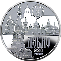 На реверсі монети вгорі праворуч – герб міста Дубно; на дзеркальному тлі абрису Дубенського замку зображено композицію з найцікавіших культових споруд міста Дубно, унизу праворуч на дзеркальному тлі написи: ДУБНО/ 920/ РОКІВ. |