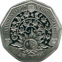 | На аверсі монети розміщено: угорі малий Державний Герб України, написи: угорі півколом - НАЦІОНАЛЬНИЙ БАНК УКРАЇНИ, унизу - номінал ДВІ ГРИВНІ та стилізовану композицію - на тлі зоряного неба зображення знаків зодіаку, місяця та сонця; рік карбування монети 2015 та логотип Монетного двору Національного банку України (праворуч), позначення металу, проби та маси Ag 925/7,78 (ліворуч). |