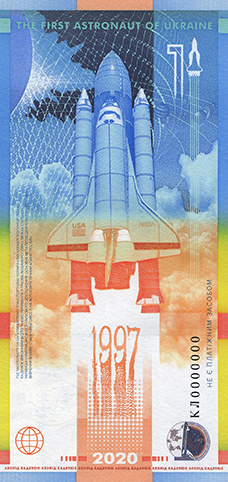 Основне зображення зворотного боку сувенірної банкноти – зображення космічного корабля “Колумбія” на тлі планет сонячної системи; над ним написи THE FIRST ASTRONAUT OF UKRAINE; праворуч – цифра 1 та зображення космічного корабля; написи: 1997 (під ракетою), 2020 (унизу); унизу праворуч вертикально: серійний номер банкноти і напис – НЕ Є ПЛАТІЖНИМ ЗАСОБОМ.