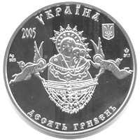 | На аверсі монети зображено Чудотворну ікону Божої Матері Святогірської, по обидва боки якої два ангели тримають дари - монети, хрести, підвіски тощо, вгорі півколом напис УКРАЇНА, праворуч - малий Державний Герб України, ліворуч - рік карбування монети - 2005, унизу півколом - П`ЯТЬ ГРИВЕНЬ; логотип Монетного двору Національного банку України. |