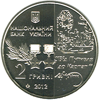 | На аверсі монети розміщено: ліворуч на дзеркальному тлі - малий Державний Герб України, під яким напис НАЦІОНАЛЬНИЙ/БАНК УКРАЇНИ, унизу номінал - 2 ГРИВНІ, рік карбування монети - 2012 та логотип Монетного двору Національного банку України, посередині - лаврова гілка та дві медалі `Золота Зірка` Героя Радянського Союзу; праворуч на матовому тлі - стилізоване зображення обкладинки книги, напис `Від Путивля/до Карпат` та факсиміле Ковпака. |