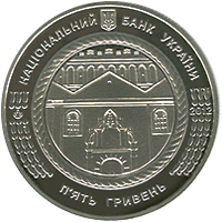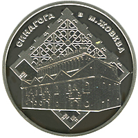 | На аверсі монети розміщено: угорі малий Державний Герб України, напис півколом НАЦІОНАЛЬНИЙ БАНК УКРАЇНИ, у центрі монети у колі зображено фрагмент фасаду будівлі синагоги, праворуч та ліворуч від якого - стилізований орнамент, рік карбування монети 2012 (праворуч), унизу напис: П`ЯТЬ ГРИВЕНЬ та логотип Монетного двору Національного банку України (ліворуч). |