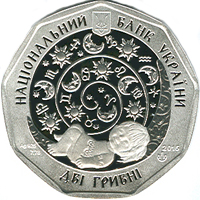 | На аверсі монети розміщено: угорі малий Державний Герб України, написи: угорі півколом - НАЦІОНАЛЬНИЙ БАНК УКРАЇНИ, унизу - номінал ДВІ ГРИВНІ та стилізовану композицію - на тлі зіркового неба зображення знаків зодіаку, під якими на місяці солодко спить дитина; рік карбування монети 2015 та логотип Монетного двору Національного банку України (праворуч), позначення металу, проби та маси Ag 925/7,78 (ліворуч). |