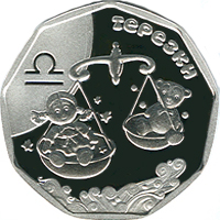 На реверсі монети зображено стилізовану композицію - ліворуч на матовому тлі символ знака зодіаку Терезів, у центрі над травою - терези на яких сидять іграшки: лялька (ліворуч) та ведмежатко (праворуч), угорі напис - ТЕРЕЗКИ. |