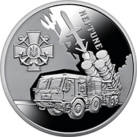 На реверсі монети зображено береговий мобільний ракетний комплекс “Нептун” у момент пуску ракети, прийнятий на озброєння Військово-морських Сил ЗСУ, про що свідчить емблема вгорі ліворуч. Дзеркальне тло відображає стилізований тризуб Нептуна, бога морів, що символізує незламність українського духу, який влучно пронизує ворожі цілі. Праворуч угорі паралельно ракеті розміщено напис NEPTUNE. |