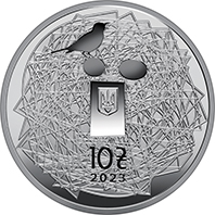| На аверсі монети розміщено: стилізовану літеру Ї із соловейком, що символізує мелодійність та співучість української мови, у центрі літери – малий Державний Герб України; на дзеркальному тлі монети розміщено текстуру із контурів літер української абетки, що асоціативно нагадує гніздо, яке є символом дому та оберегом родини; унизу – номінал монети 10 та графічний знак гривні, рік карбування монети – 2023. |