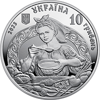 | На аверсі монети розміщено: угорі малий Державний Герб України, ліворуч і праворуч від якого написи півколом: УКРАЇНА, рік карбування монети – 2023; номінал монети – 10/ГРИВЕНЬ; у центрі зображено господиню під час приготування українського борщу на тлі печі, що символізує неперервність життя народу, тепло, затишок, добробут, родинне щастя, оздоблену орнаментом за трипільським мотивом, який уособлює вікову історію і традицію приготування борщу. |