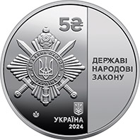 | На аверсі монети розміщено: на дзеркальному тлі емблему Управління державної охорони України (ліворуч), номінал 5 та графічний символ гривні (угорі над емблемою); малий Державний Герб України, написи: УКРАЇНА / 2024, логотип Банкнотно-монетного двору Національного банку України (унизу під емблемою); праворуч на матовому тлі девіз: ДЕРЖАВІ / НАРОДОВІ / ЗАКОНУ. |