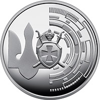 На реверсі монети на дзеркальному тлі розміщено стилізовану композицію, що символізує різні історичні періоди становлення України та захист держави українськими воїнами, хоробрість яких крізь покоління залишається незмінною. Ліворуч на композиції зображено стилізований тризуб; у центрі зображено булаву з шаблями, щитом, оздобленим козацьким хрестом, що є символами влади, бойового побратимства та захисту; праворуч – фрагмент об’єктива камери, що символізує сучасні технології в організації процесу охорони та безпеки. |