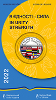 На реверсі монети на дзеркальному тлі розміщено: угорі півколом написи двома мовами В ЄДНОСТІ – СИЛА/IN UNITY STRENGTH, під якими стилізована композиція з кольорових прапорів (використано тамподрук) країн, які надають Україні всебічну допомогу: США, Великобританії, Польщі, Канади, Естонії, Литви, Латвії, Італії, Швейцарії, Чехії, Швеції, Нідерландів, Німеччини, Франції, Японії.