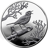 На реверсі монети на дзеркальному тлі зображено соловейка на стволі автомата, стилізовані гілки дерев (угорі та внизу). |