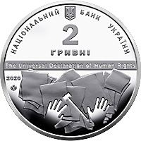 | На аверсі монети розміщено: малий Державний Герб України (угорі) та написи: НАЦІОНАЛЬНИЙ (ліворуч від герба), БАНК УКРАЇНИ (праворуч від герба), 2/ ГРИВНІ (під гербом), THE UNIVERSAL DECLARATION OF HUMAN RIGHTS (по центру); ліворуч – рік карбування монети – 2020, під яким – логотип Банкнотно-монетного двору Національного банку України; унизу на тлі аркушів паперу – руки та суддівський молоток (як символ прийняття суддівських рішень). |