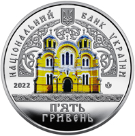 | На аверсі монети розміщено: угорі на дзеркальному тлі – малий Державний Герб України, праворуч і ліворуч від якого напис півколом НАЦІОНАЛЬНИЙ БАНК УКРАЇНИ; на орнаментальному тлі – головний фасад собору (використано тамподрук), під яким орнаментальний фриз; унизу номінал монети – П’ЯТЬ/ГРИВЕНЬ; рік карбування 2022 – ліворуч від собору, логотип Банкнотно-монетного двору Національного банку України – праворуч. |