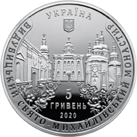 | На аверсі монети розміщено: угорі – малий Державний Герб України, над яким напис півколом УКРАЇНА; у центрі на дзеркальному тлі зображено знакові будівлі архітектурного комплексу Видубицького монастиря в оточенні квітів; зазначено написи: 5/ГРИВЕНЬ/2020 (унизу) та ВИДУБИЦЬКИЙ СВЯТО-МИХАЙЛІВСЬКИЙ МОНАСТИР (півколом); логотип Банкнотно-монетного двору Національного банку України (ліворуч серед квітів). |