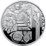 На реверсі монет зображено композицію: у центрі – сходи, що символізують давню історію монастиря, на першій сходинці яких напис – ХІ ст.; ліворуч – стилізовані іконографічні образи святих, праворуч від сходів – образ ченця, унизу відбиток печатки князя Всеволода, праворуч від неї – герб полковника М. Миклашевського, коштом якого побудовано Георгіївський собор (1696–1701). |