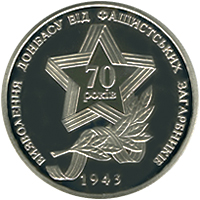 На реверсі монети на дзеркальному тлі зображено композицію: зірка зі стрічки ордена Слави, у центрі якої напис 70/років, лаврова гілка і розміщено написи ВИЗВОЛЕННЯ ДОНБАСУ ВІД ФАШИСТСЬКИХ ЗАГАРБНИКІВ (по колу) та 1943 (унизу). |