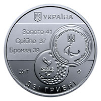 | На аверсі монети розміщено: угорі малий Державний Герб України та напис - УКРАЇНА (праворуч), під яким логотип Національного Паралімпійського комітету України та стилізовану медаль паралімпійських ігор, ліворуч від яких написи: ЗОЛОТО 41/СРІБЛО 37/БРОНЗА 39; на дзеркальному тлі - рік карбування монети 2017, унизу півколом номінал ДВІ ГРИВНІ, логотип Банкнотно-монетного двору Національного банку України (праворуч). |
