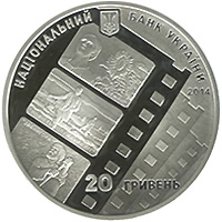 | На аверсі монети розміщено: угорі малий Державний Герб України, напис півколом НАЦІОНАЛЬНИЙ БАНК УКРАЇНИ, під яким праворуч - рік карбування монети 2014; стилізовану композицію: на кіноплівці - кадри з фільмів `Земля`, `Повість полум`яних літ`, `Звенигора`; унизу номінал - 20 ГРИВЕНЬ. |