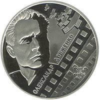 На реверсі монети зображено: портрет Олександра Довженка (ліворуч), напис ОЛЕКСАНДР ДОВЖЕНКО (по діагоналі), на тлі кіноплівки роки життя - 1894/1956 (праворуч), угорі - стилізованих птахів, що уособлюють поетичні мрії художника. |